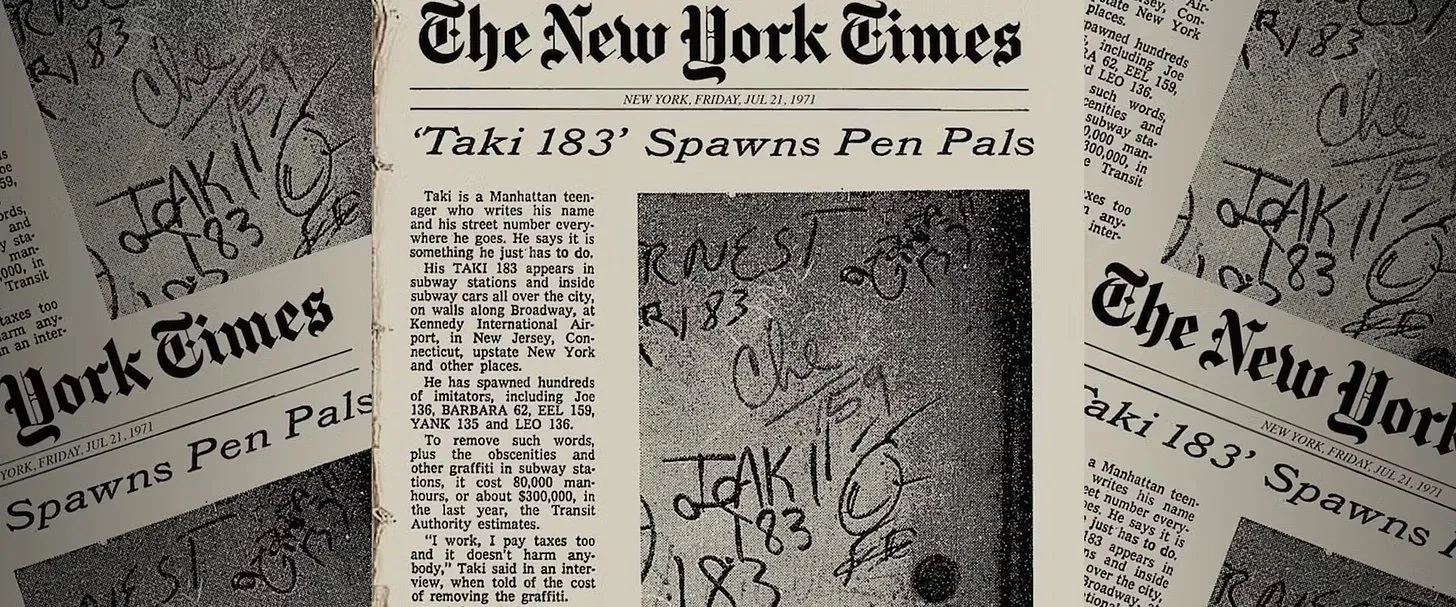 Taki era il soprannome di un un ragazzo greco che lavorava come postino a New York, 183 era il suo indirizzo. Grazie al suo lavoro Taki aveva la possibilità di girare per la città in lungo e in largo, e, pennarello alla mano, iniziò a lasciare il proprio segno.